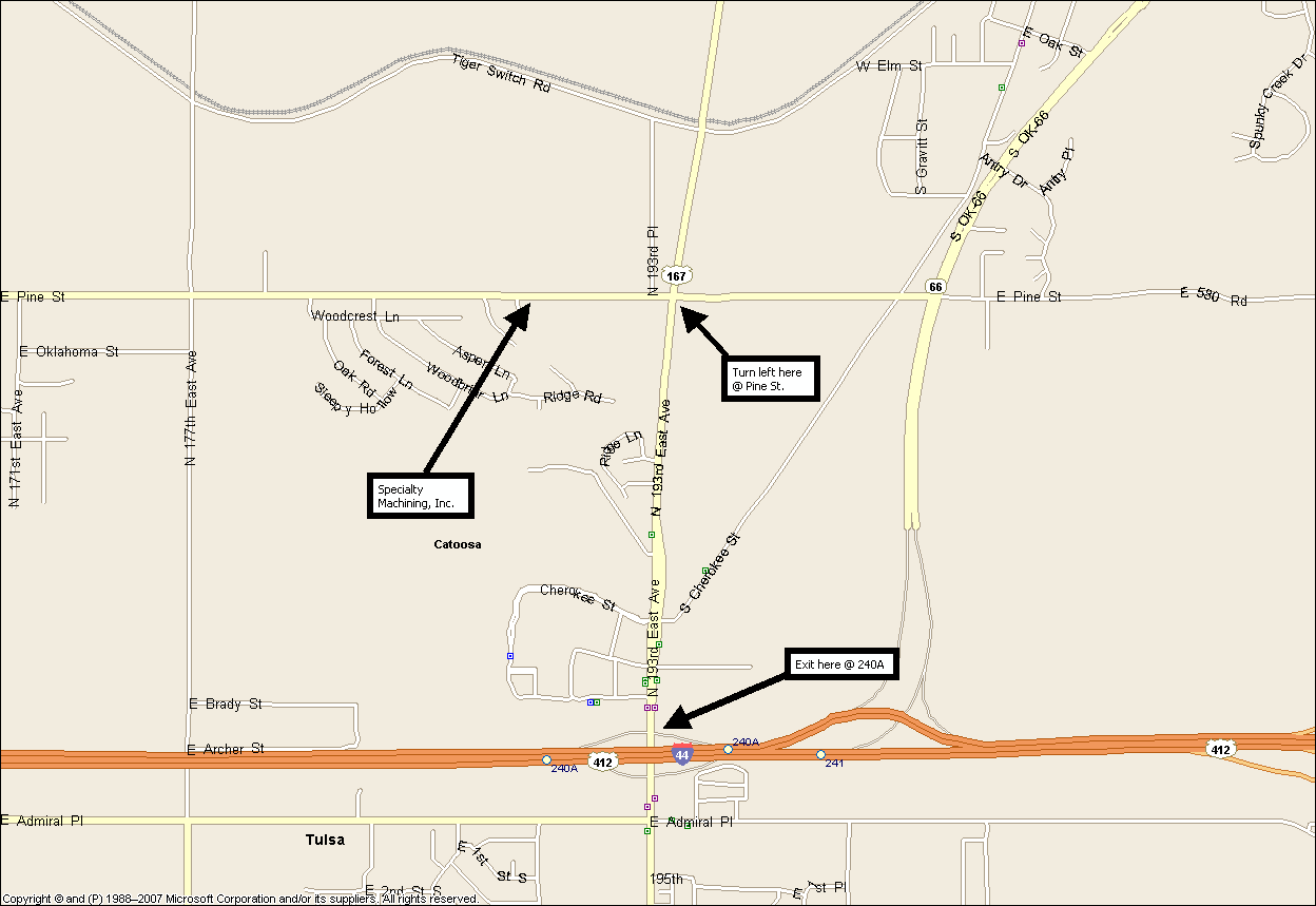 Specialty Machining, Inc. is conveniently located @ 19100 E. Pine St. Catoosa, OK 74015 near exit 240A on 412 just East of Tulsa. If you have any questions related to our location, please call us at 918-266-3626, and we will be glad to assist you.